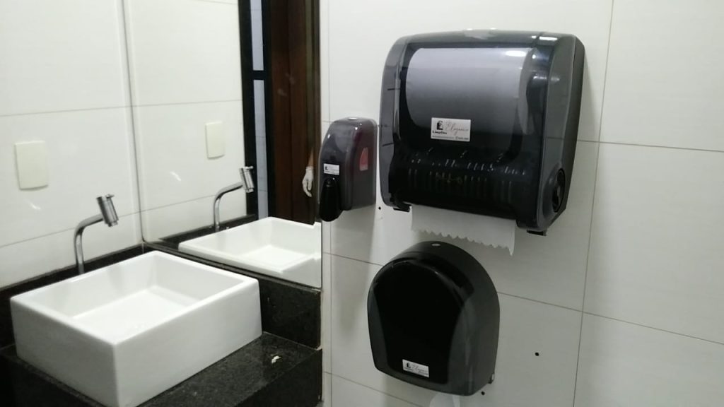 Toalheiros, saboneteiras, dispensers de álcool gel, suportes de papel higiênico e acessórios de higiene corporativa.